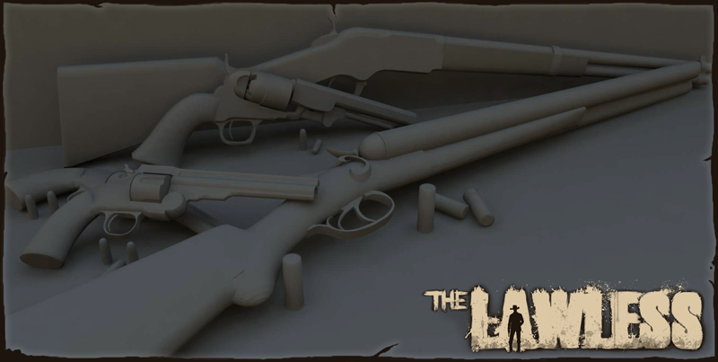 The first of the set of WIP pictures are of the un-textured models of some of the weapons featured in the game. In this render you can see the Single Action Army revolver, the Schofield revolver, Winchester rifle and the Double Barrelled shotgun. When I get round to it, I will upload textured pictures.